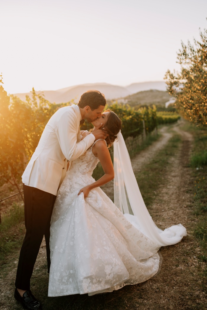 Dugmad na leđima, diskretni čipkani detalji na ramenima i dugački šal koji se vijori iza mladenke stvaraju siluetu koja je istovremeno moderna i romantična.