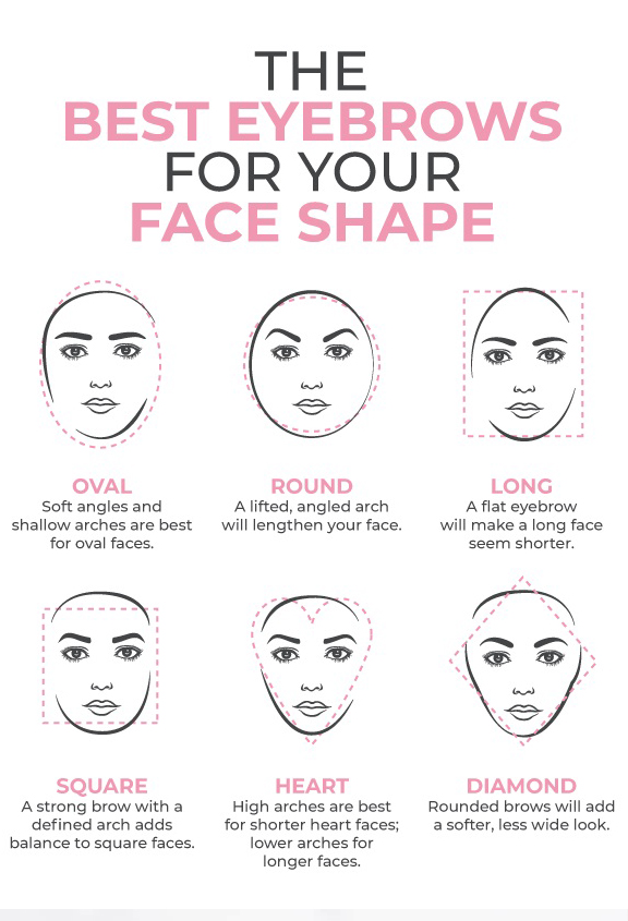 Na primjer, okrugla lica imaju tendenciju da najbolje izgledaju sa strukturiranim obrvama s oštrijim zaobljenim lukovima i dužim krajevima, dok damama s licem u obliku srca najčešće najbolje pristaju obrve s mekim zaobljenim lukovima. Zbog toga, neka vaš prvi korak bude određivanje oblika vašeg lica u skladu s ilustracijom ispod.