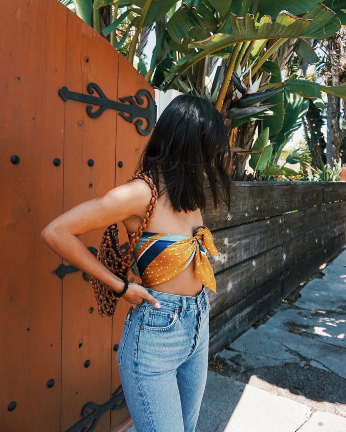 Trendsetterice širom svijeta prihvaćaju maramu kao ljetni top trend, preklapajući otisnute svilene marame na pola kako bi stvorili dijamantske oblike koji su pričvršćeni na leđima. To je jednostavan stilski trik koji u nekoliko sekundi stvara statement siluetu i chic izgled.