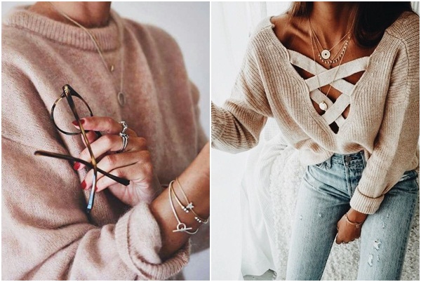 Više decentnih ogrlica koje tvore zanimljiv niz popraćen raznim privjescima, detaljima i porukama dat će osobnost pletivu i lijepo naglasiti njegovu teksturu. Ovaj duo unijet će svježinu u vaše stilske zapise i iznova kreirati efektna izdanja, neovisno o tome kombinirate li pletivo uz suknju, traper ili poslovne hlače. Osim toga zlatni nakit uvijek daje posebnu dozu glamura zbog čega ovu modnu slagalicu volimo još više. Jeste li vi već isprobali ovaj trik?