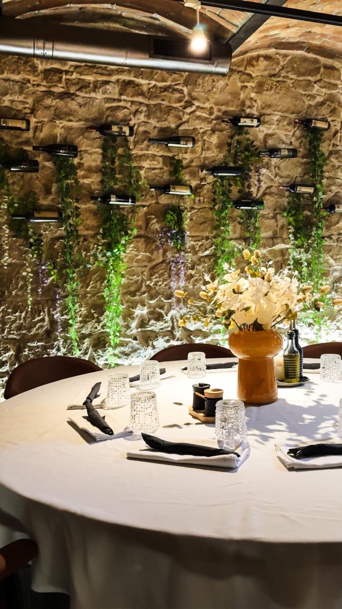 Svjetlost suptilno naglašava teksturu kamenih zidova, dok elegantni detalji poput crnih zavjesa, umjetničkih slika i visećih lampi dodaju osjećaju luksuza. Posebno nas je osvojio zid s vinskim bocama koji djeluje poput koji podsjeća na tradicionalne vinarije, ali u modernoj interpretaciji.