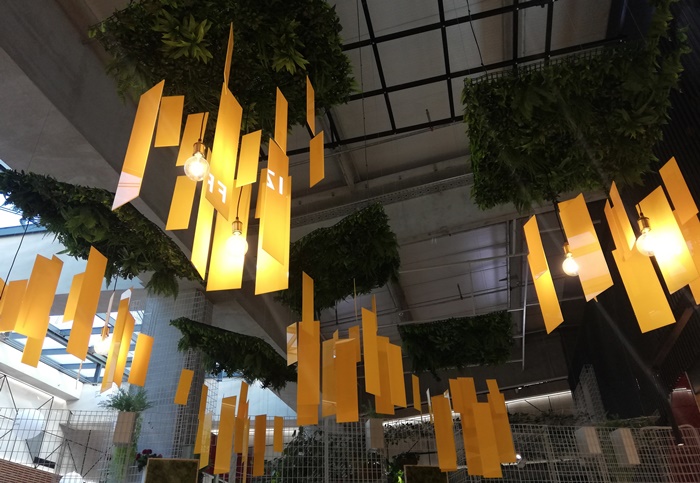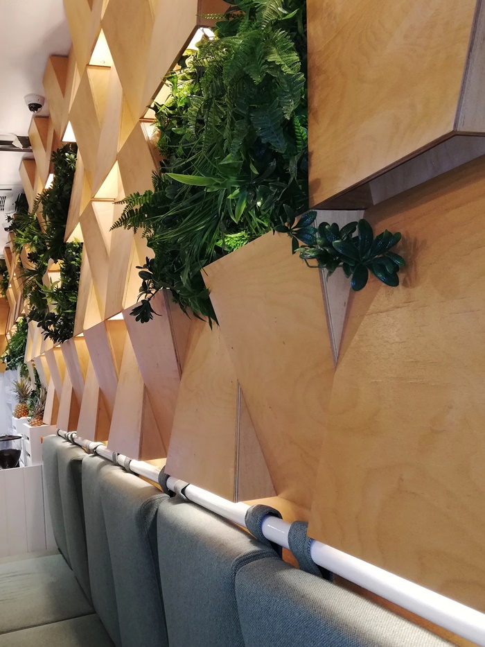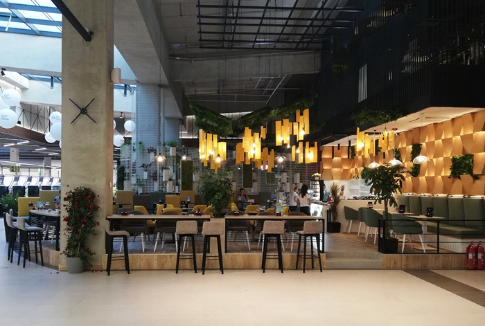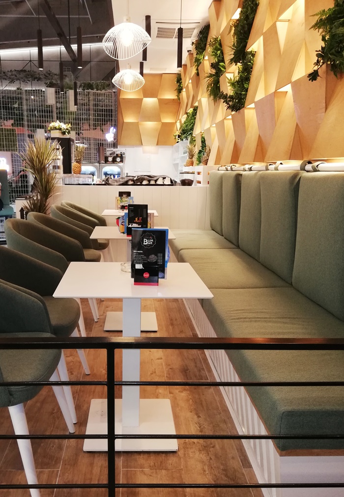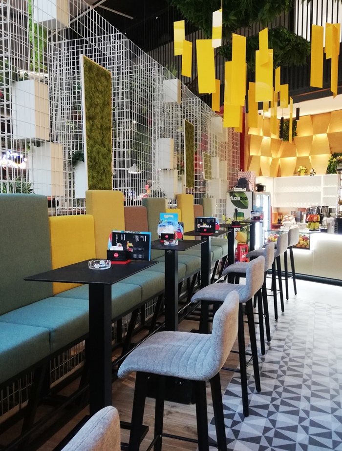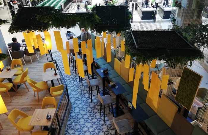 „Prvi izazov nam je bila sama osnova prostora koja je u obliku "komada pizze". S obzirom na to da se prostor nalazi u tržnom centru, morali smo poštovati pravila i smjernice od strane projektanata kao što su: slobodne vizure bez zatvorenih ploha (osim postojećeg zida) i šank na datoj dispoziciji (bez premiještanja) itd. Radi visine od cca 6 metara, izazovno je bilo postaviti i stropnu metalnu konstrukciju te na njoj razvesti rasvjetu i sve detalje poput zelenila i preko 300 žutih ploha. Samo montaža žutih ploha je trajala 2 dana jer se svaka montirala posebno. :) Zatim, zidna obloga dužine 8 metara sa integrisanom led rasvjetom je bila zahtjevna za izradu i montažu. S obzirom na navedeni oblik osnove, prostor je podijeljen u 3 cjeline (bočni dio visoko sjedenje, centralni dio nisko sjedenje s kombinacijom visokog sjedenja s druge strane stola i nisko sjedenje ispred drvene zidne obloge) s dvije hodne linije.“ – nadodao je Emil Imamović koji je također dio DESIGNITEKT STUDIO. Pogledajte!
